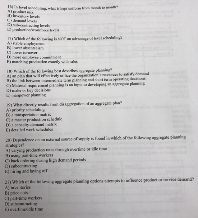 Typically one to three months E. Which of the following best describes aggregate planning. Just gallons of paint without concern for the different colors and sizes B. The intermediate range c. In doing aggregate planning for a firm producing paint the aggregate planners would most likely deal with. The long range B. A the link between intermediate-term planning and short-term operating decisions B a collection of objective planning tools C make-or-buy decisions D an attempt to respond to predicted demand within the constraints set by product process and location decisions E manpower planning.