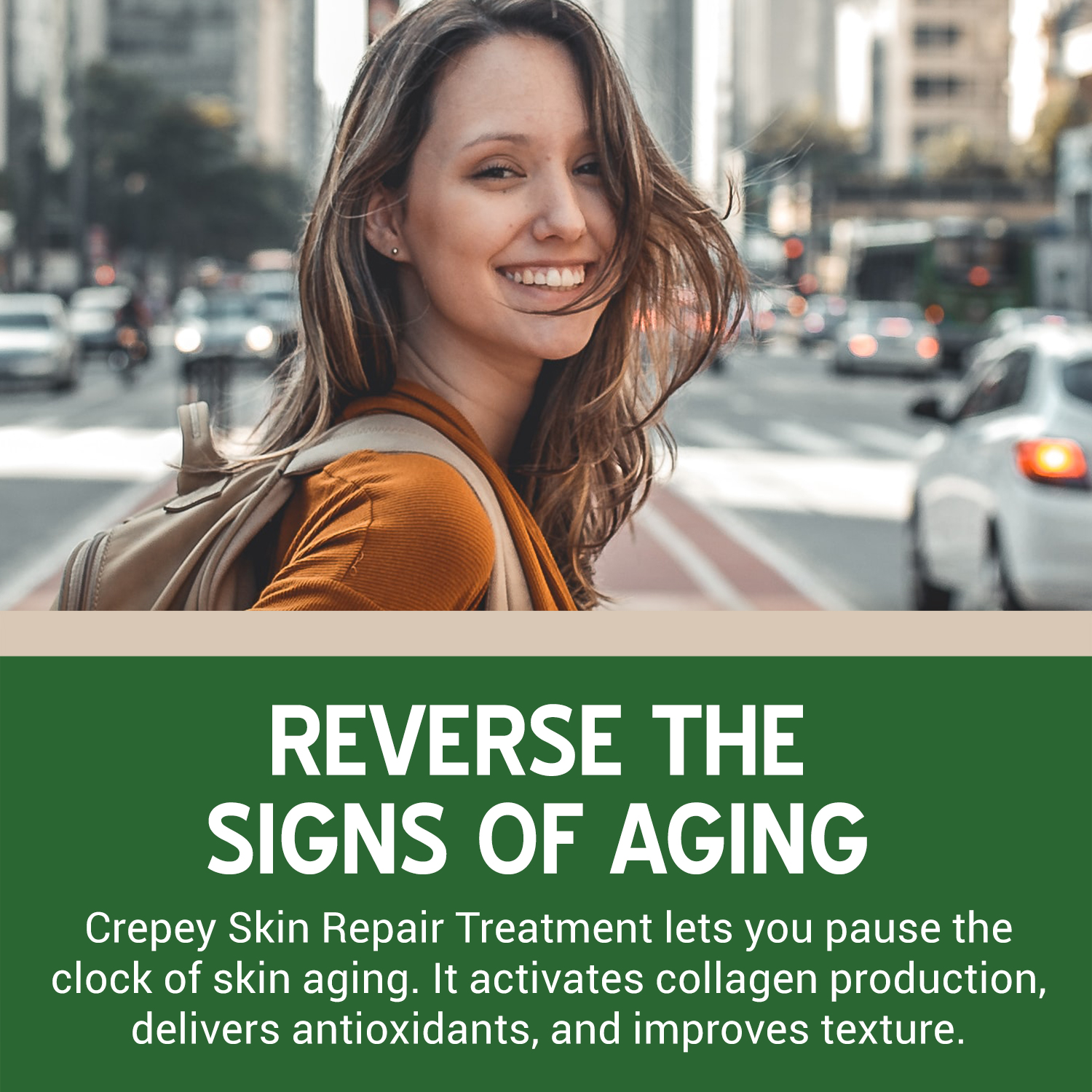 If you want to put an end to your crepey skin woes try this TreeActiv Crepey Skin Facial Cleanser. Our Crepey Skin Repair Treatment is formulated specifically for aging skin. This product which can be used for the face neck chest legs and arms contains hyaluronic acid vitamin E antioxidants and essential fatty acids.
