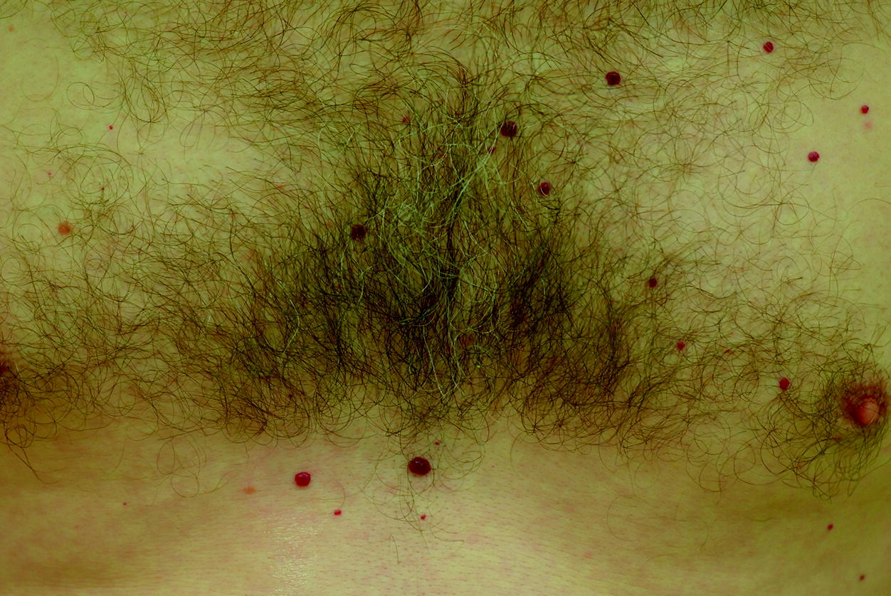 Ein tardives Hämangiom zeigt sich als hellroter rubinroter Fleck oder als intensiv gerötetes kirschrotes Knötchen. Lebenshälfte und oft in grosser Zahl am Körper vorkommen sind in der Regel mit dem Gefässlaser sehr einfach zu entfernen.