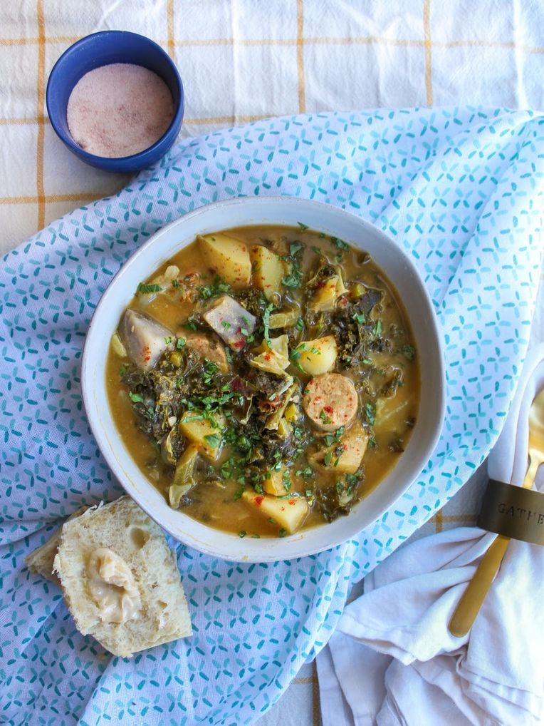 Crock pot Portuguese soup recipe. Prepare the kale by rinsing thoroughly and tearing the leafy portions from the stems. Add onion or leek and garlic season with salt and pepper and cook stirring frequently until softened but not browned about 5 minutes adding olive oil as necessary to keep the mixture loose and moist.